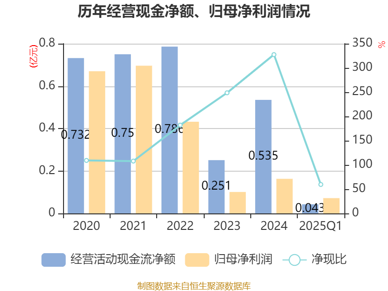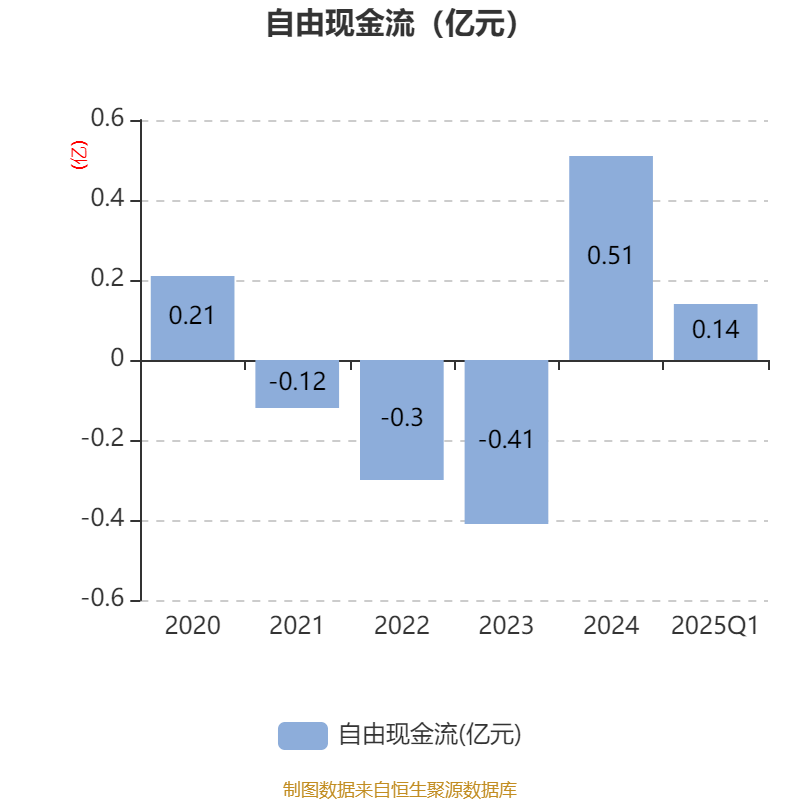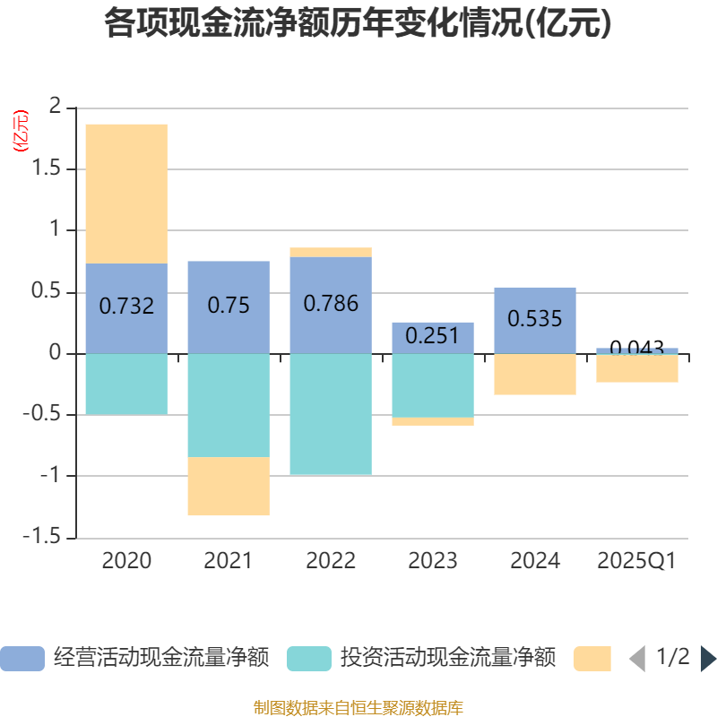 截至2025年一季度末,公司经营活动现金流净额为430.78万元,同比增加623.79万元;筹资活动现金流净额-2210.24万元,同比减少2325.79万元;投资活动现金流净额-138.03万元,上年同期为-2699.11万元。
