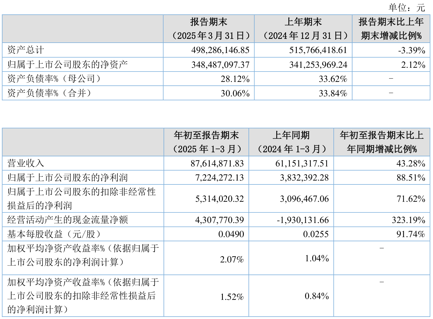 负债重大变化方面拾贝赢,截至2025年一季度末,公司短期借款较上年末减少33.38%,占公司总资产比重下降5.42个百分点;长期借款占公司总资产的3.01%,上年末为0;应付票据及应付账款较上年末减少12.24%,占公司总资产比重下降0.65个百分点;其他应付款(含利息和股利)较上年末减少32.45%,占公司总资产比重下降0.49个百分点。