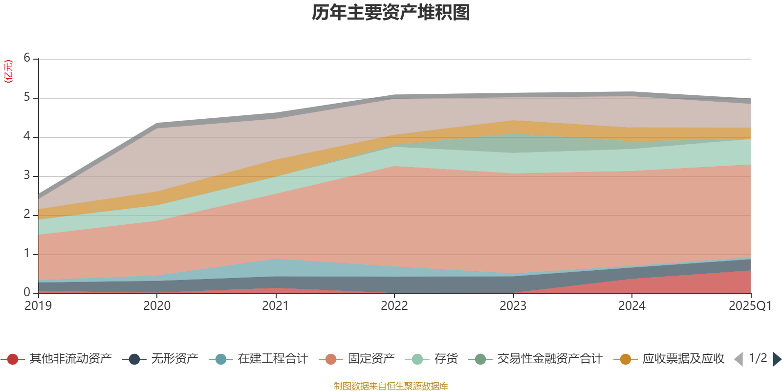 资产重大变化方面,截至2025年一季度末,公司其他非流动资产较上年末增加57.39%,占公司总资产比重上升4.51个百分点;交易性金融资产合计较上年末减少100%,占公司总资产比重下降3.88个百分点;货币资金较上年末减少23.98%,占公司总资产比重下降3.3个百分点;存货较上年末增加15.6%,占公司总资产比重上升2.14个百分点。