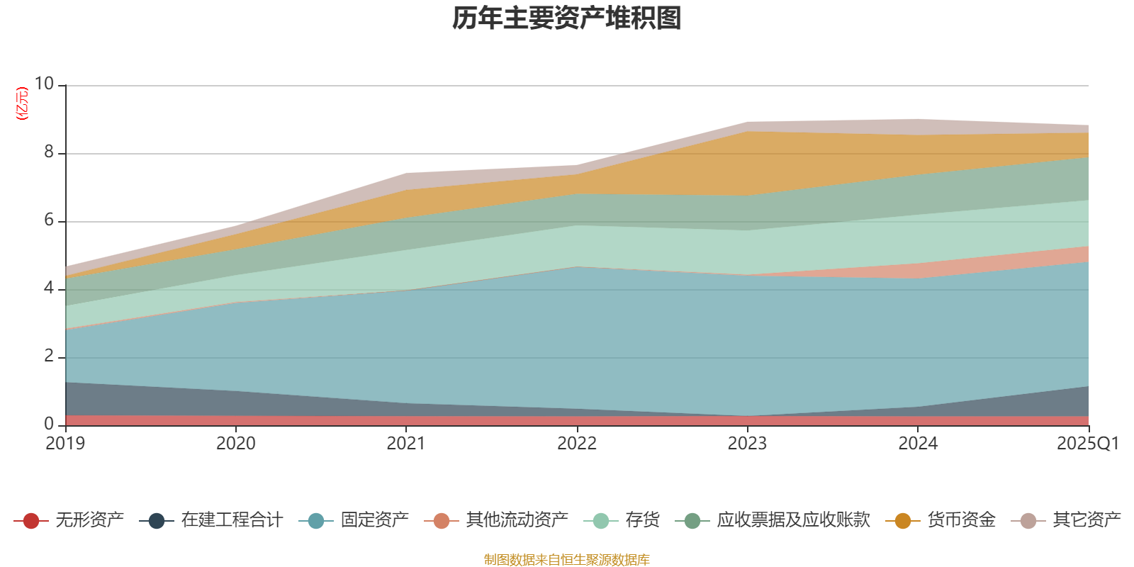资产重大变化方面,截至2025年一季度末,公司在建工程合计较上年末增加217.08%,占公司总资产比重上升6.94个百分点;货币资金较上年末减少37.93%,占公司总资产比重下降4.75个百分点;其他非流动资产较上年末减少83.24%,占公司总资产比重下降2.84个百分点;应收票据及应收账款较上年末增加7.31%,占公司总资产比重上升1.24个百分点。