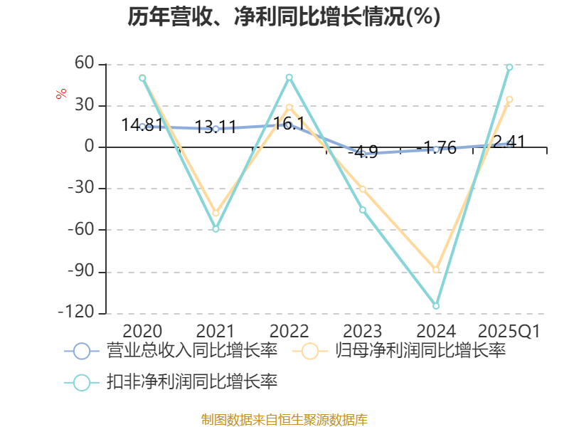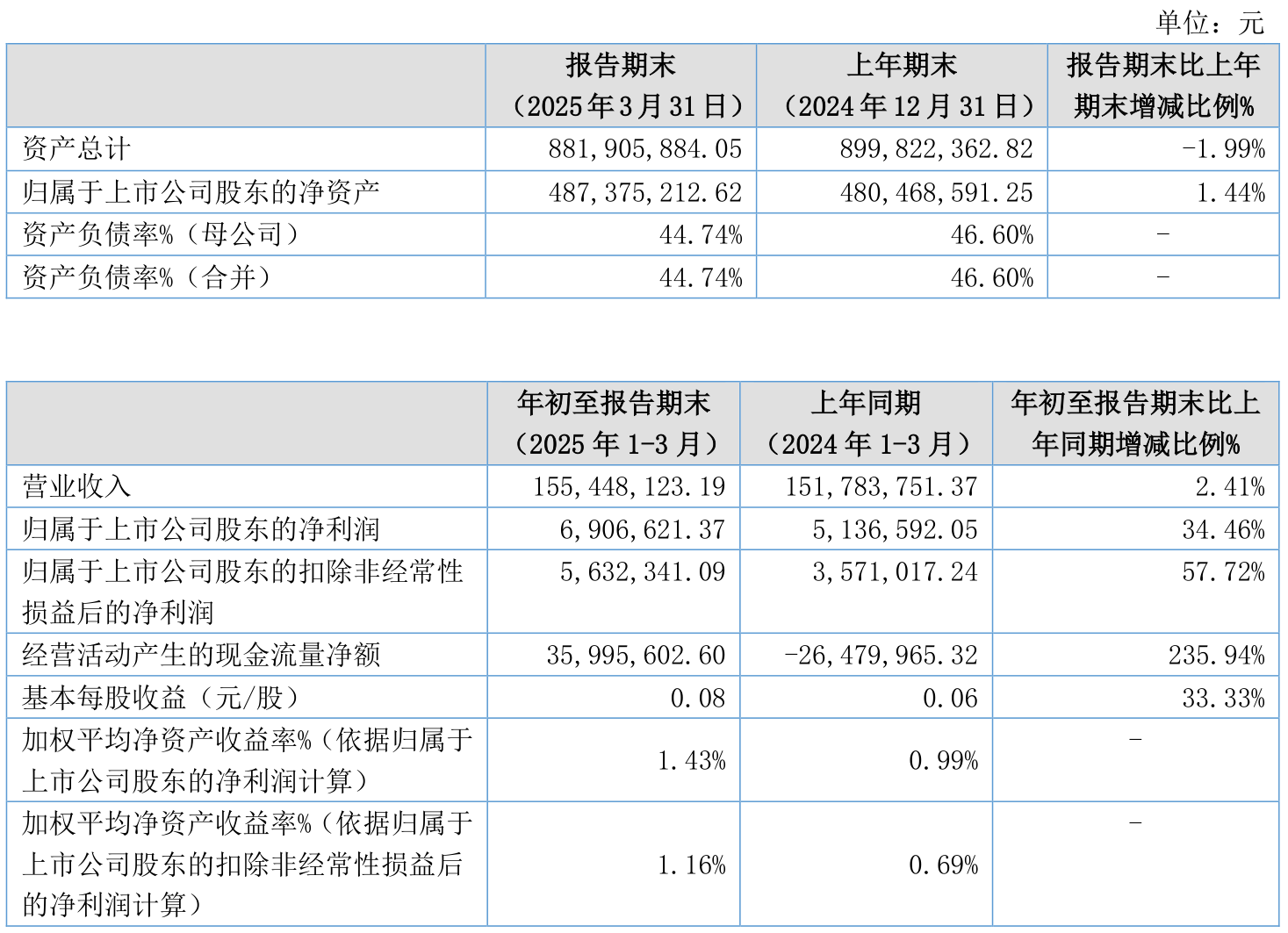 负债重大变化方面,截至2025年一季度末,公司短期借款较上年末减少19.45%,占公司总资产比重下降4.46个百分点;长期借款占公司总资产的3.23%,上年末为0;应付职工薪酬较上年末减少45.53%,占公司总资产比重下降0.5个百分点;一年内到期的非流动负债较上年末增加5.99%,占公司总资产比重上升0.23个百分点。